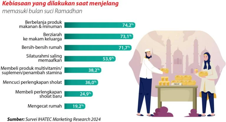 Bulan Ramadhan selalu kita nanti kehadirannya. Setiap individu memiliki caranya sendiri dalam menyambut hadirnya bulan suci ini. Mereka sibuk mempersiapkan banyak hal, seperti beres-beres rumah, belanja stok bahan makanan, belanja bahan pembersih, dan masih banyak lagi. Dalam hal ini, IHATEC Marketing Research menanyakan dalam surveinya terkait dengan kebiasaan yang dilakukan menjelang bulan suci Ramadhan. Sebanyak 74,2% responden menjawab bahwa menjelang bulan Ramadhan mereka berbelanja produk makanan dan minuman. Hasil ini menjadi perolehan terbesar yang kemudian disusul dengan berziarah ke makam keluarga (73,1%), bersih-bersih rumah (71,7%), silaturahmi saling memaafkan (53,9%), membeli produk multivitamin/suplemen/penambah stamina (38,2%), mencuci perlengkapan sholat (36%), membeli perlengkapan sholat baru (24,9%), dan mengecat rumah (19,2%).