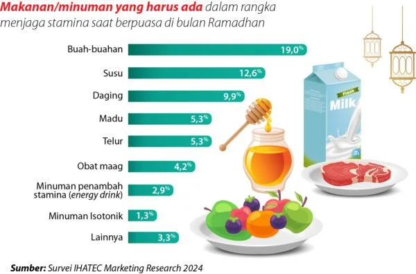 Mengonsumsi buah-buahan menjadi pilihan pertama dalam menjaga stamina saat berpuasa dengan persentase sebesar 19,0%. Kemudian, disusul dengan susu (12,6%) dan daging (9,9%). Vitamin yang terkandung pada buah-buahan dapat membantu menjaga kesehatan dan daya tahan tubuh kita saat berpuasa. Mengonsumsi buah yang tinggi serat juga dapat membuat kenyang lebih lama. Tak heran banyak yang mengonsumsi buah saat sahur dan berbuka.