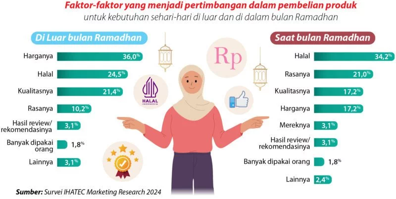 Sebagaimana kita tahu, bulan ramadhan adalah bulan yang penuh berkah. Dimana orang-orang berbondong-bondong melakukan kebaikan, termasuk juga di dalam menjaga makanan dan minuman yang dikonsumsi. Kehalalan menjadi lebih diperhatikan oleh umat Mmuslim selama Ramadhan. Hal ini sesuai dengan hasil survei IHATEC Marketing Research mengenai faktor pertimbangan dalam pembelian produk untuk kebutuhan sehari-hari.